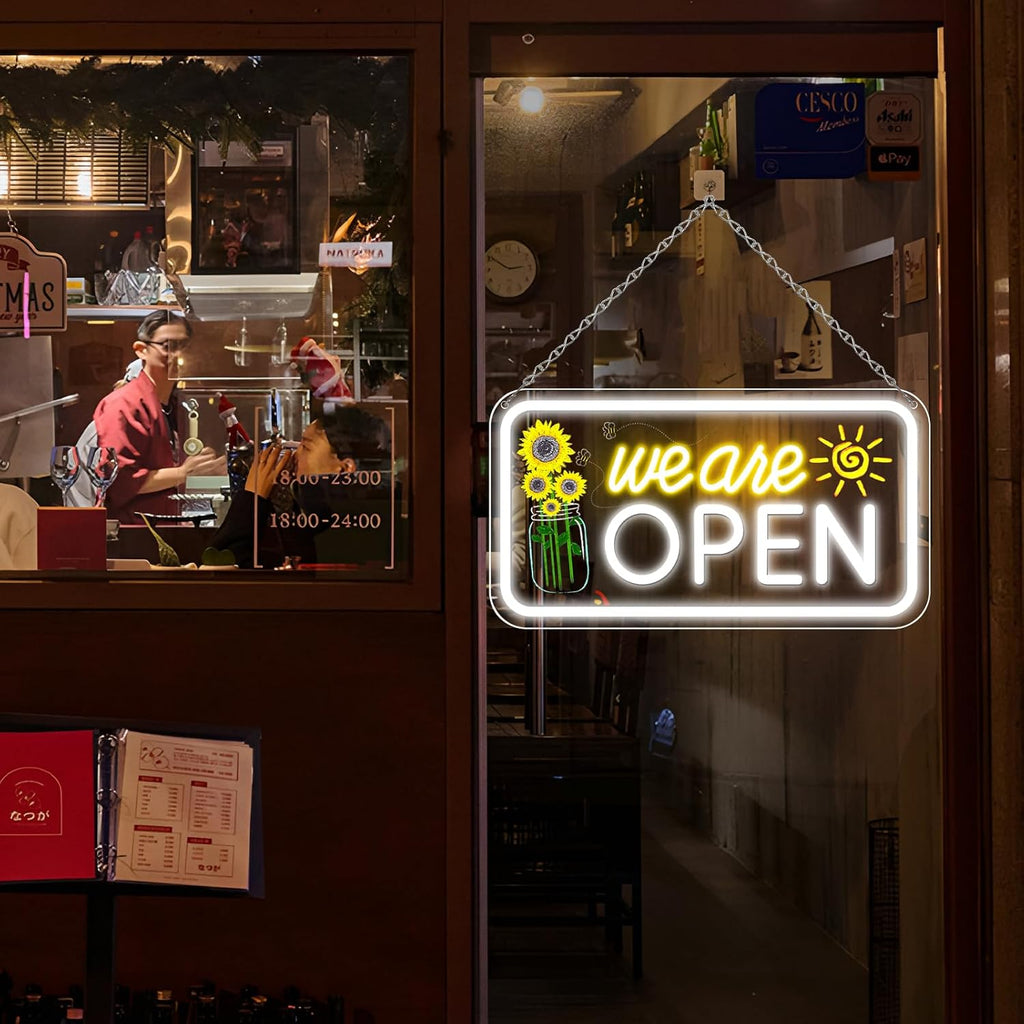 Vertikales Neonschild „Wir haben geöffnet“ – Warmweißes und weißes Leuchten | 17×9 Zoll | Zum Aufhängen im Fenster | Plug & Play für Schaufenster