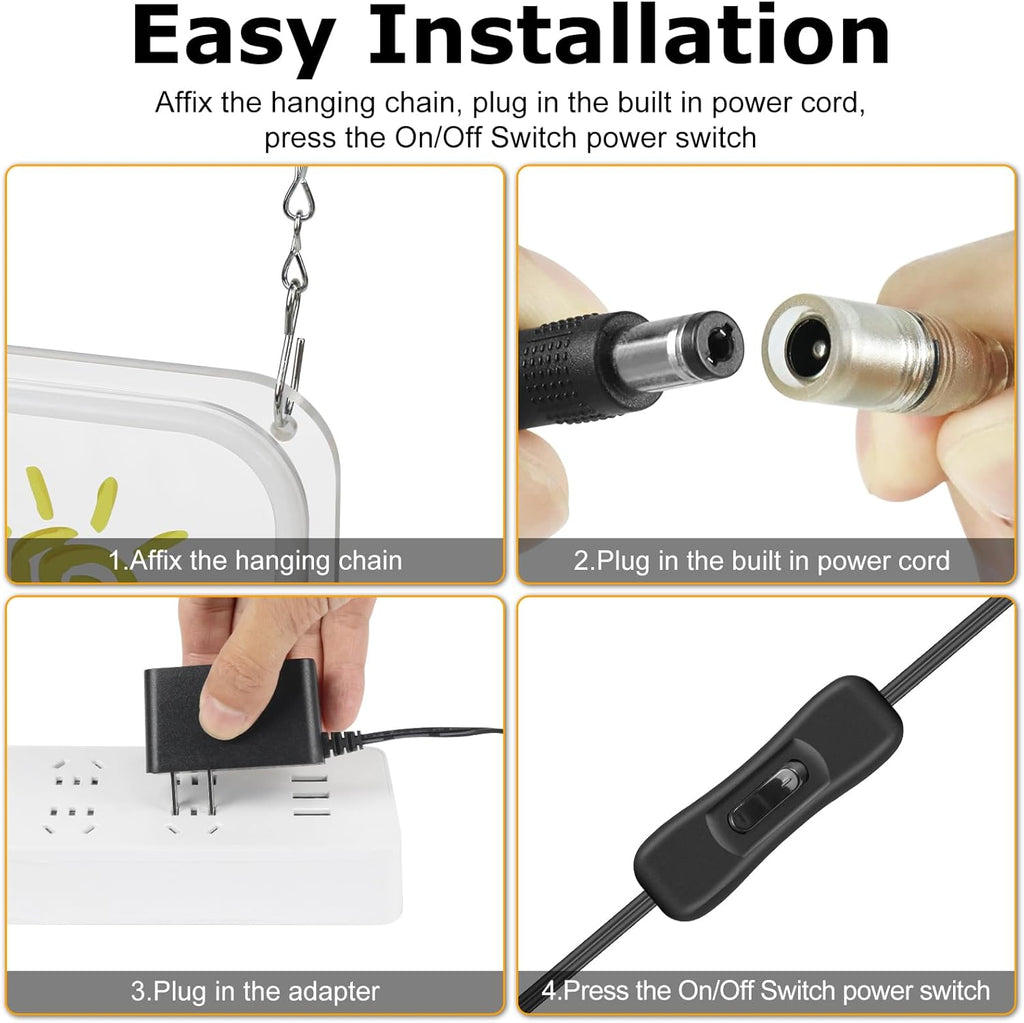 | Warmweiß, 17×9 Zoll (42×23 cm), 12-V-Adapter mit US-Stecker | LED-Schild „Wir haben geöffnet“ ×1, Hängekette ×1 (100 cm / 39 Zoll), Verlängerungskabel mit Controller ×1 (200 cm / 78 Zoll), 12-V-Adapter mit US-Stecker ×1 |