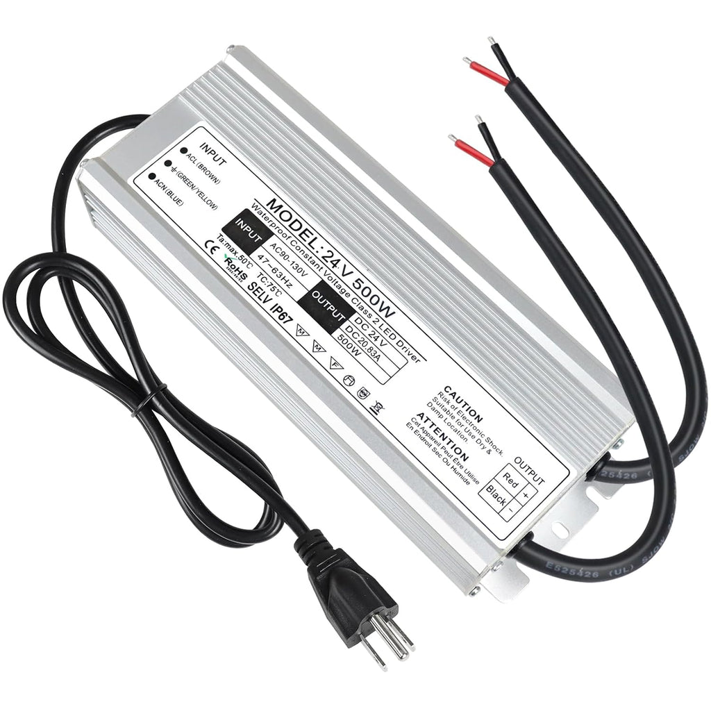 24V Waterproof LED Driver, 175–265V Input, 200W–500W, Single/Dual Wire Output, Outdoor Power Adapter, CE/RoHS/FCC — UK/EU Plug & Wire Leads, Outdoor Lighting Adapter