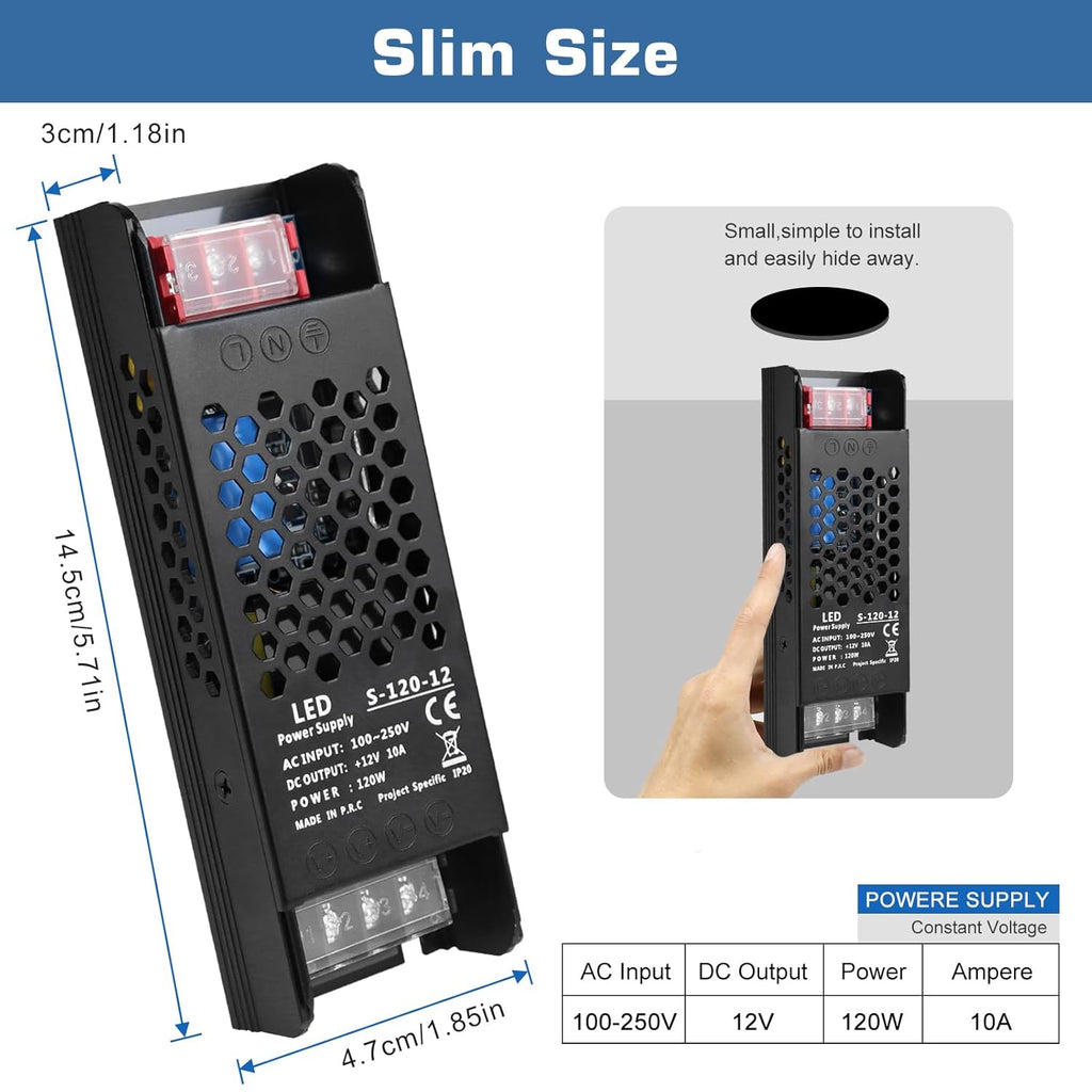 | 120W 12V DC (1-Pack) | 1 × 120W 12V DC Slim Black Switching Power Supply, 1 × User Manual |