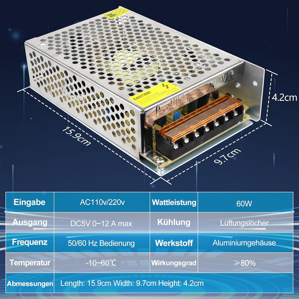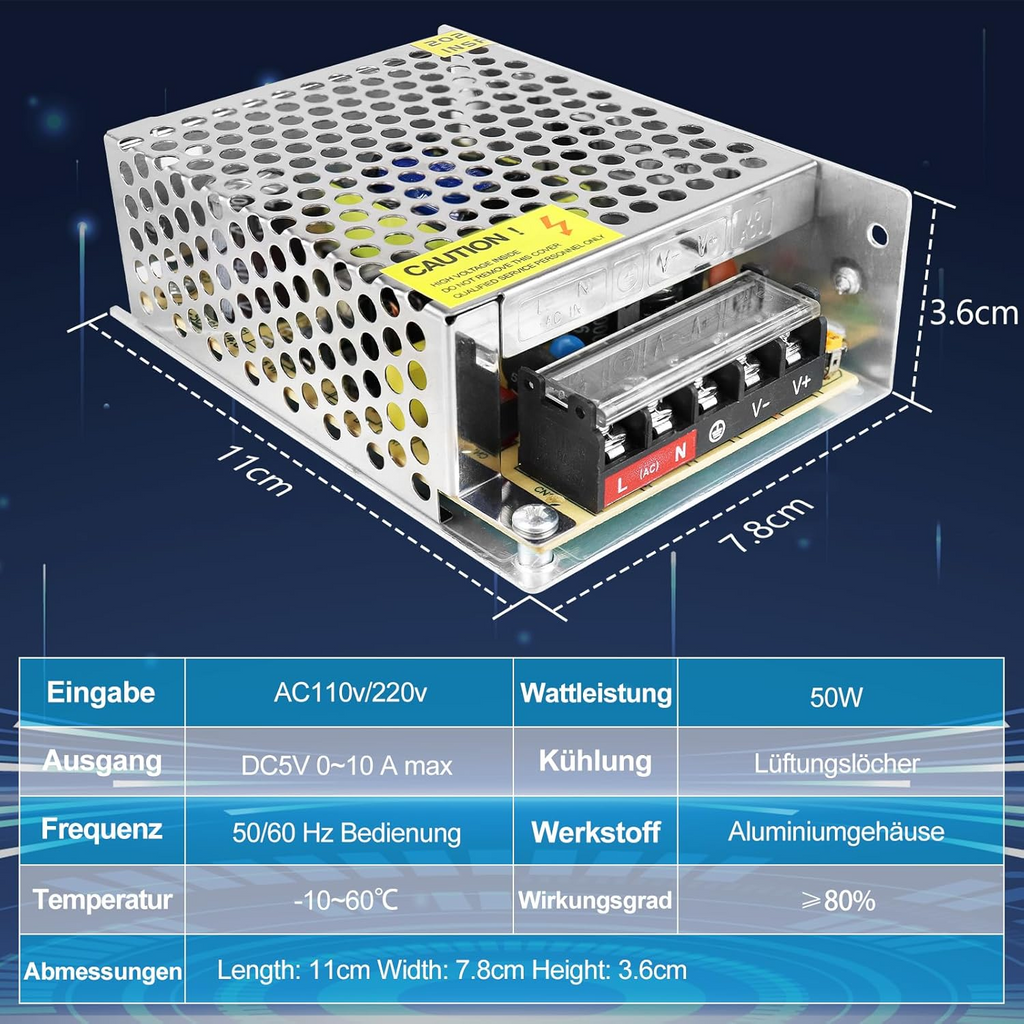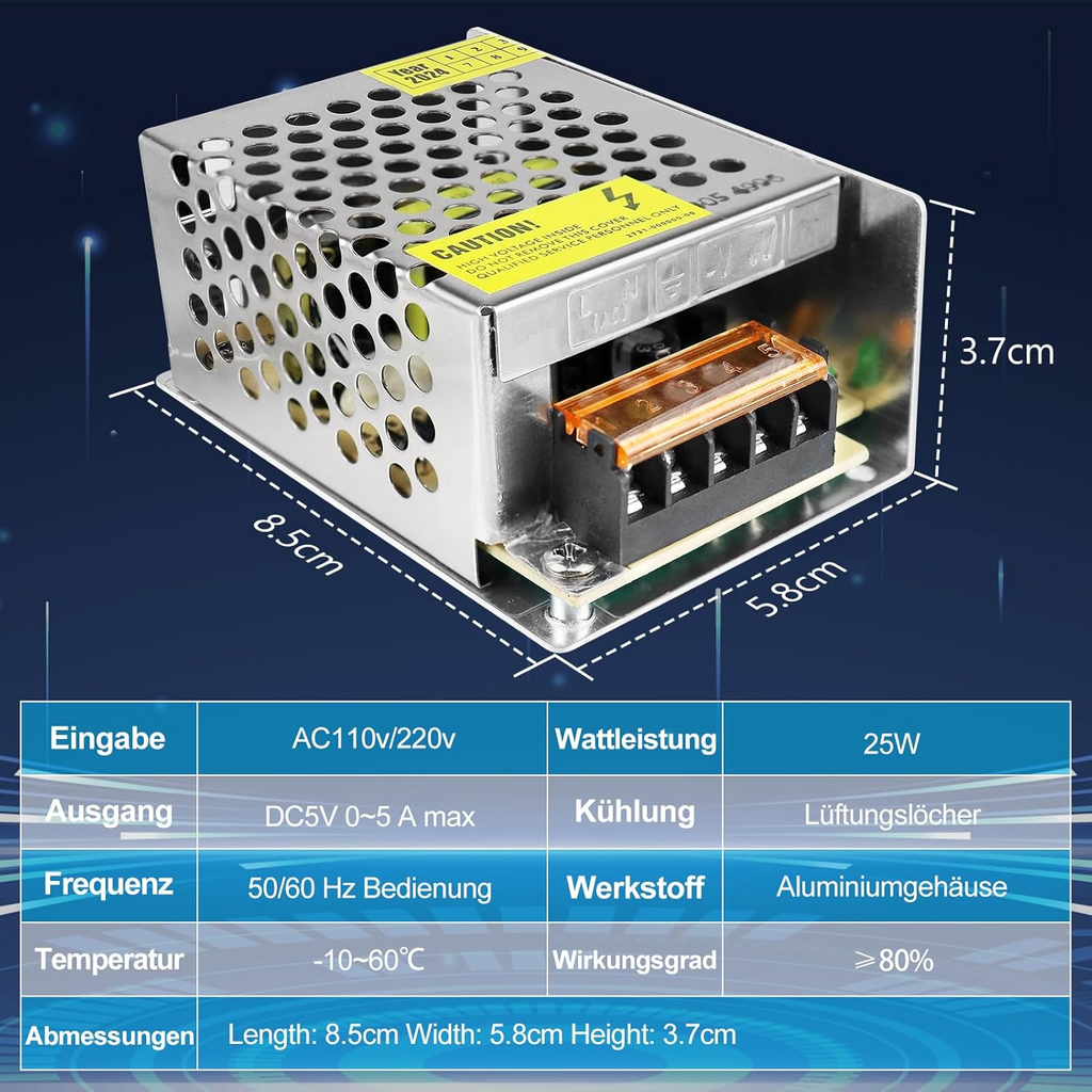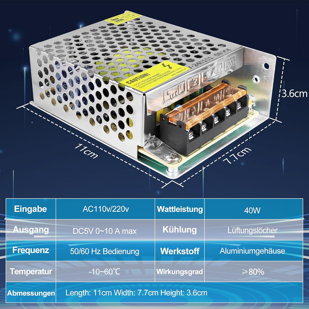 - Output Voltage / Wattage: 5V DC, 10W–300W