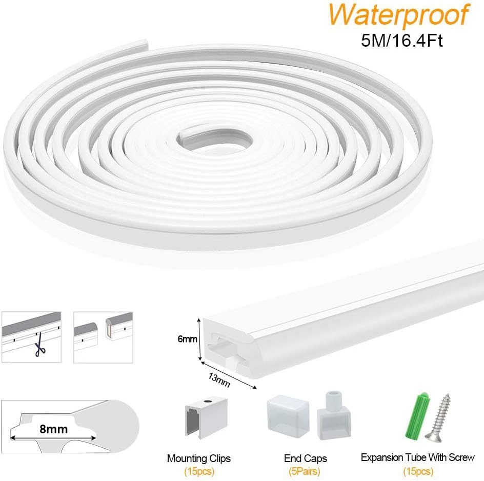 | Compatible LED: 8mm Strip / Pack Size: 16.4FT (5M) | 1 × 5m silicone LED channel tube (cuttable) 10 × end caps 15 × mounting clips 15 × screws (LED strip not included) |