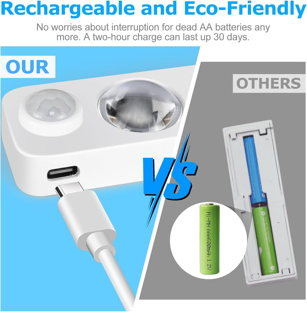 - Rechargeable Cabinet Light: Built-in battery charged via the included USB cable. ~6 hours continuous ON per full charge, or up to ~30 days in motion-sensing night-light use.